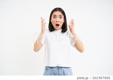 Shocked and scared asian woman, gasping and looking worried at camera, isolated on white background