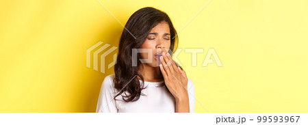 Close-up of tired and sleepy african-american girl, yawning and looking exhausted, standing in white t-shirt over yellow background