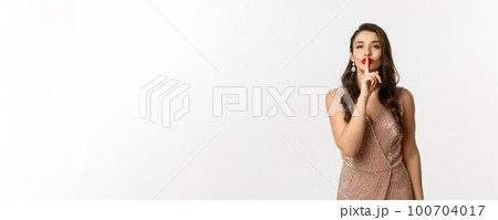 Christmas, holidays and celebration concept. Young sensual woman hushing at camera, telling secret, showing taboo gesture, wearing party dress and red lipstick, white background