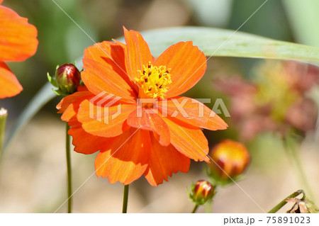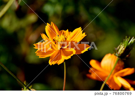 調布市深大寺元町の植物園に咲くオレンジ色のキバナコスモスの花