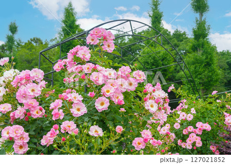 ピンク色のバラのアーチと青空(神奈川県綾瀬市 光綾公園「あやせローズガーデン」)