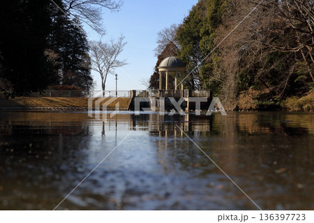 ロマンチック茨城(凍える朝の池にたたずむパビリオン。英国の空間に触れた気がする。)水戸市、七つ同公園