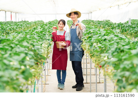 収穫したイチゴを手にして笑顔を見せる若い男女