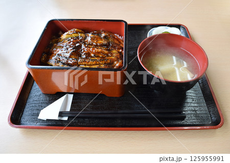 鰻の蒲焼きを卵でとじて三つ葉を乗せた鰻玉重とお吸い物と香の物を白背景で撮影