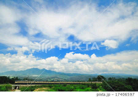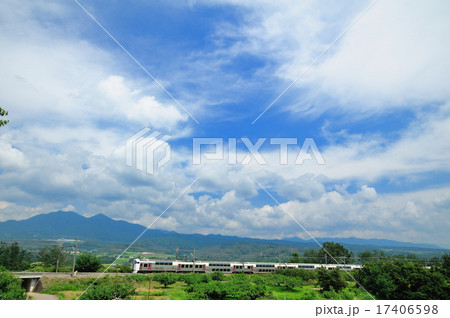茅ヶ岳と夏雲をバックに新府桃源郷を走るホリデー快速ビューやまなし号