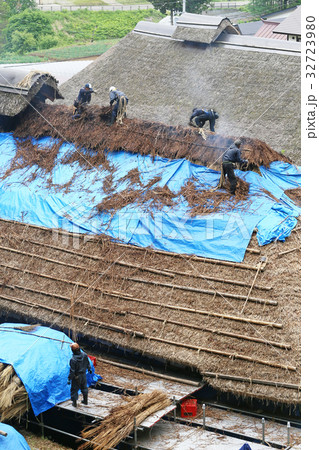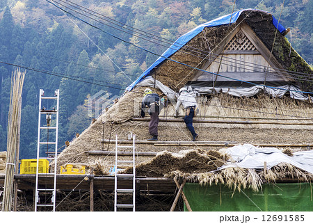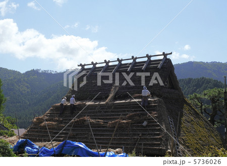 茅葺き屋根の葺き替え 茅葺き屋根 作業する人 修復作業 イメージ素材