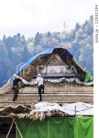 茅葺屋根の葺き替え 茅葺き屋根 作業する人 葺き替え作業 修復作業 イメージ素材