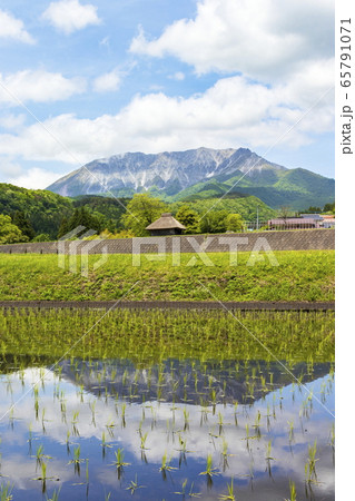新緑と国立公園大山_のどかな初夏の風景_茅葺小屋と水田に映る逆さ大山