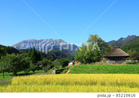 鳥取県 快晴の大山と実りの秋を迎えた御机の茅葺小屋