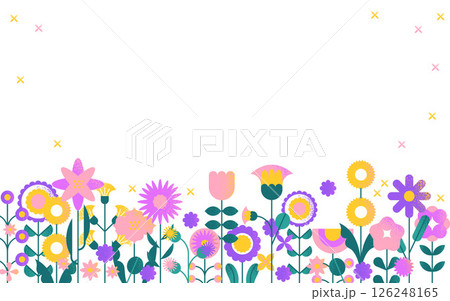 Flower field border background. Geometric floral spring summer garden banner with blooming plants, abstract simple flowers bloom decorative greeting card frame. Vector illustration