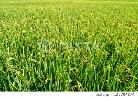 A large area of rice fields with mountains background under the blue sky in Hualien, Taiwan.