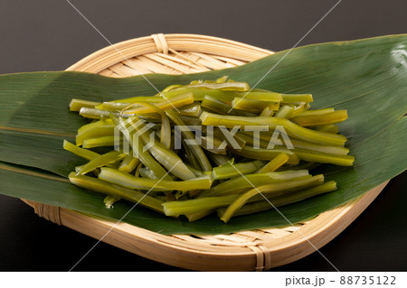 とれたて!あざやかな緑色の新鮮な茹で茎わかめ全面アップ画像