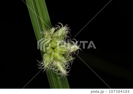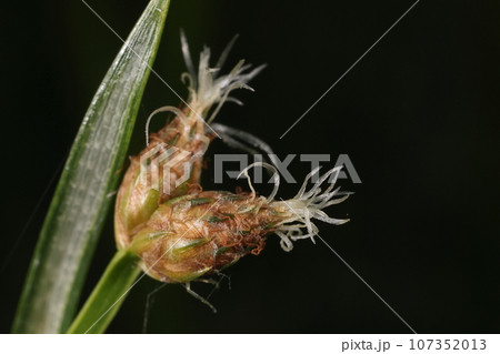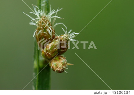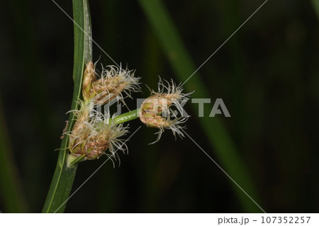 自然 植物 サンカクイ、水辺の植物。卵形の小穂、白い糸は雌しべの柱頭で二又になっています