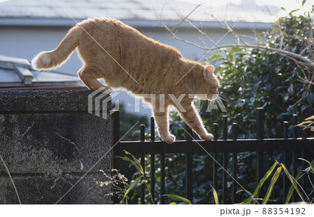 早朝に塀の上を探検する茶トラ猫_晴天横1