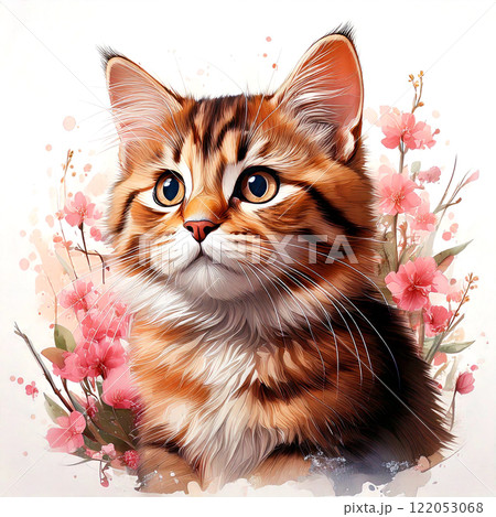 桜の花とリアルな茶とら猫の春を感じさせるイラスト