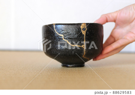 金継された黒い抹茶茶碗でもてなす