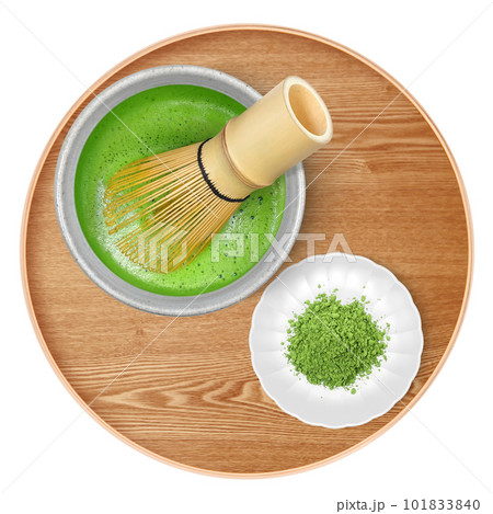 抹茶と茶筅、抹茶パウダー、お茶の葉の水彩画