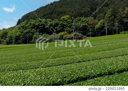 岐阜県の揖斐茶の収穫をしている風景。茶畑と茶摘採機械。