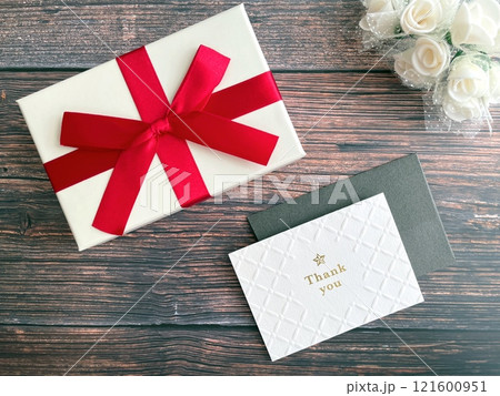 茶色いリボンのプレゼントボックスと花束とサンキューカード