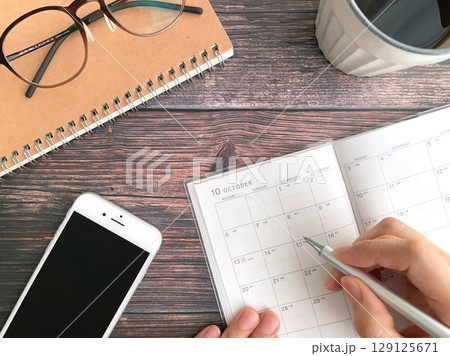 10月のスケジュール帳に記入する女性の手と机上のスマホ