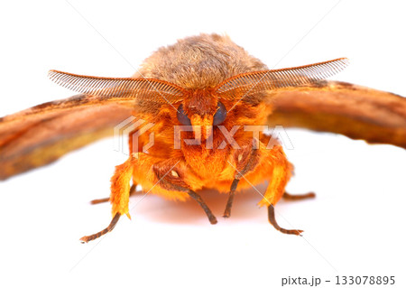 白背景に止まる茶色のマツカレハ蛾、俯瞰