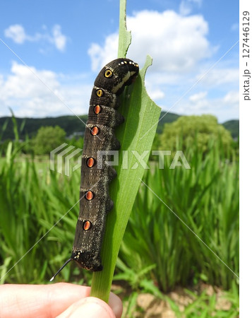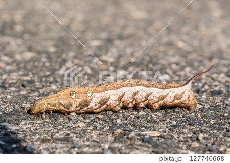 生き物 昆虫 ブドウスズメ、幼虫です。大きさは八センチ前後、すべすべでひんやりした触り心地