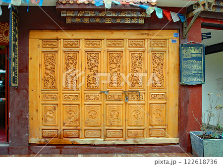 中国 雲南省 香格里拉 シャングリラ旧市街の伝統的な木製のドア