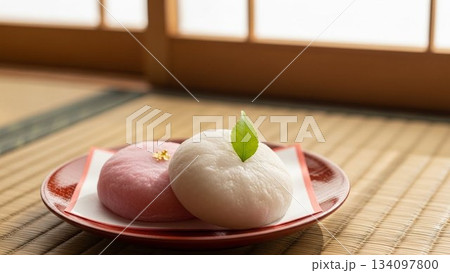 和室の光に照らされた饅頭と木皿の静かな和風食卓シーン