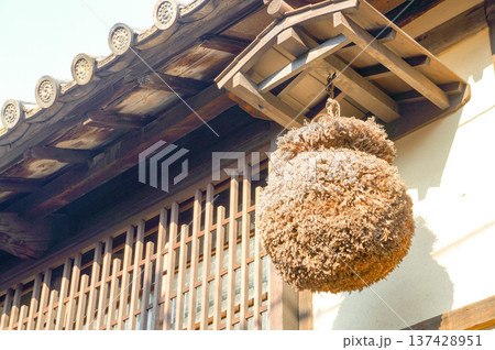 杉玉と瓦屋根が映える伝統的な日本建築