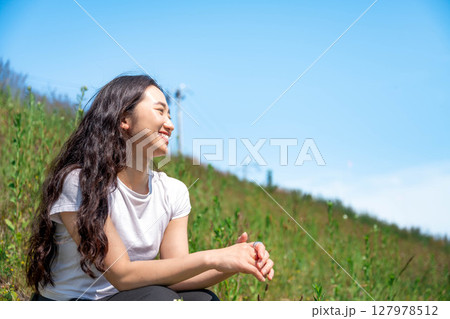 青空の下でリラックスする若い女性