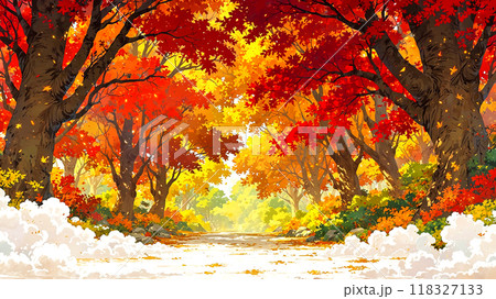 Colorful autumn landscape with golden and red falling leaves and sunny weather