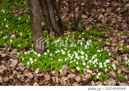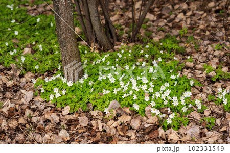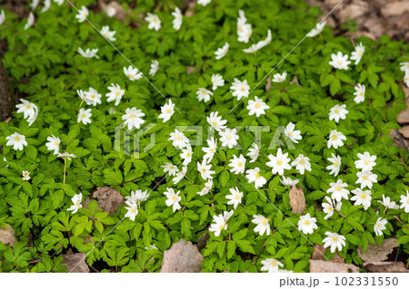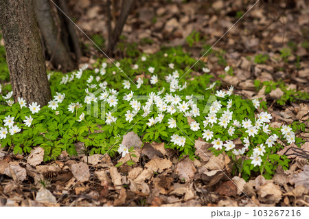 lush cover of the first spring white flowers wood anemones among the dry foliage
