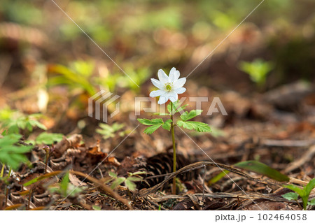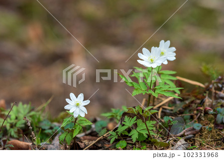 first spring flowers wood anemones among the dry foliage in the forest