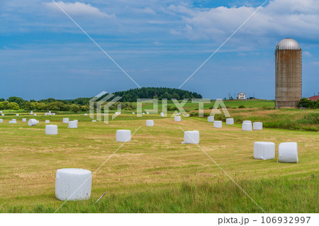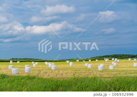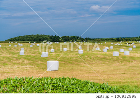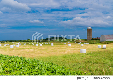 北海道らしい風景・ロールベールラップサイロの点在する採草地