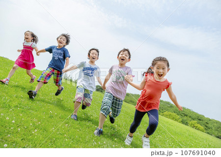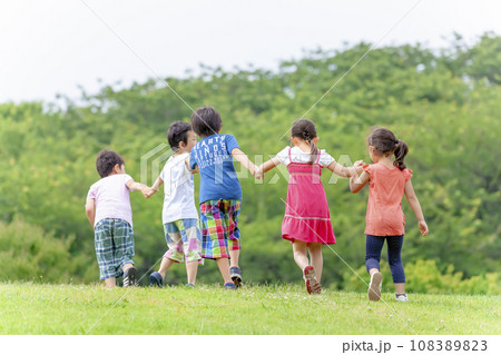 公園の丘を手をつないで駆け上がる小学生たちの後ろ姿