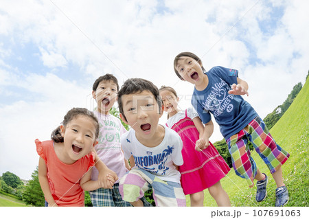 公園の草地で遊ぶ小学生たちの後ろ姿