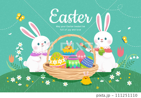 Happy Easter card, wreath with little chicks, color eggs, and spring twigs, Hand drawn watercolor illustration isolated on white background.