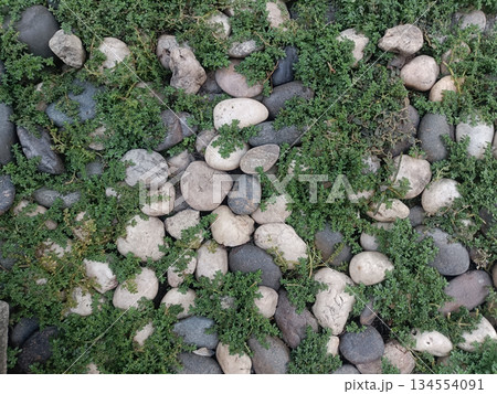 Stone ground texture rock pebble background nature green plant foliage cover grey white smooth stone garden design pattern