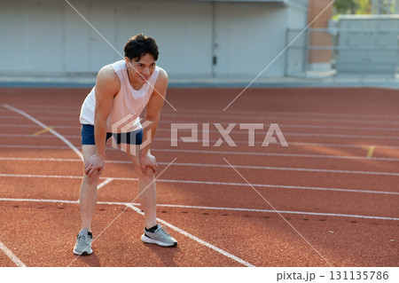 Asian man in white tank top looking ahead while standing with hand on knee, take a rest after run.