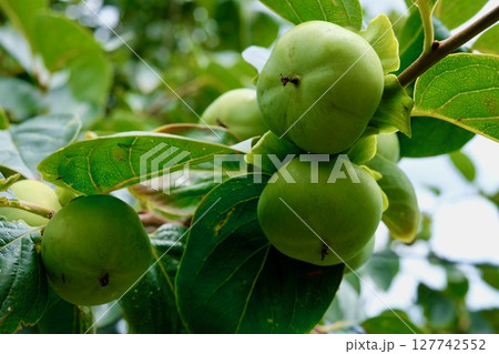 6月の畑で実る日本の青い柿(未熟果・クローズアップ)