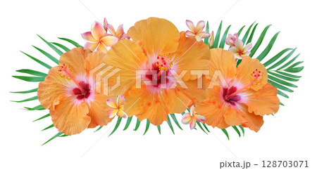 Orange Hibiscus flowers and plumeria flowers with palm leaves in a tropical arrangement