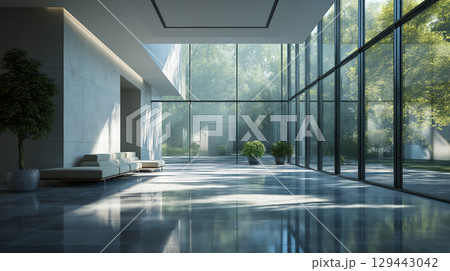 大きなガラス窓から光が差し込むモダンなロビーの内観パース