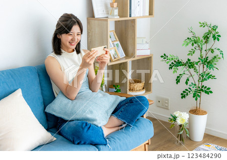 リビングでスマホを使う若い女性