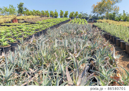 Panorama Fan aloe plants in a pot with a triangle arrangement on a dirt ground