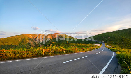 (群馬県)志賀草津道路(さわやか街道)を走る車 後方は白根山