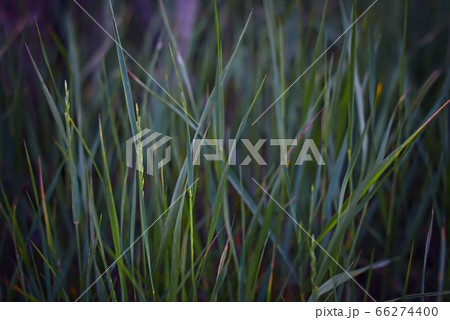 A lot of green grass stalks with long leaves with a soft focus. Herb, herbaceous background, beautiful herbal texture. Close-up, selective focus.
