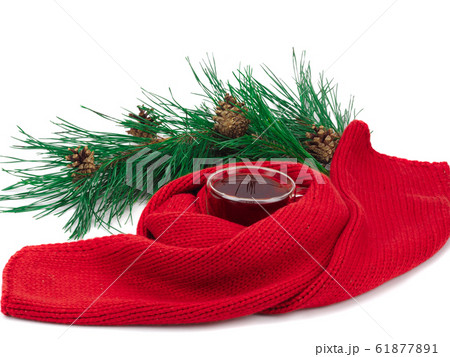 black tea in the cup, scarf around the cup and a branch of spruce