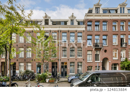 A picturesque view of charming historical buildings lined along a street, showcasing unique architecture, greenery, and parked bicycles in a vibrant urban setting.
