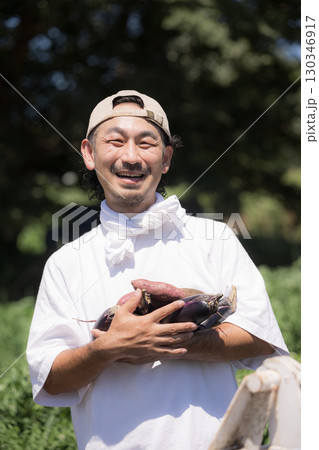 畑で野菜を収穫する男性 農家や農業で働くする人のイメージ カメラ目線の笑顔のクローズアップ