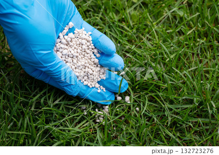 Hand in blue glove fertilizing grass with mineral NPK fertilizer. Applying fertilizer to the lawn for better growing